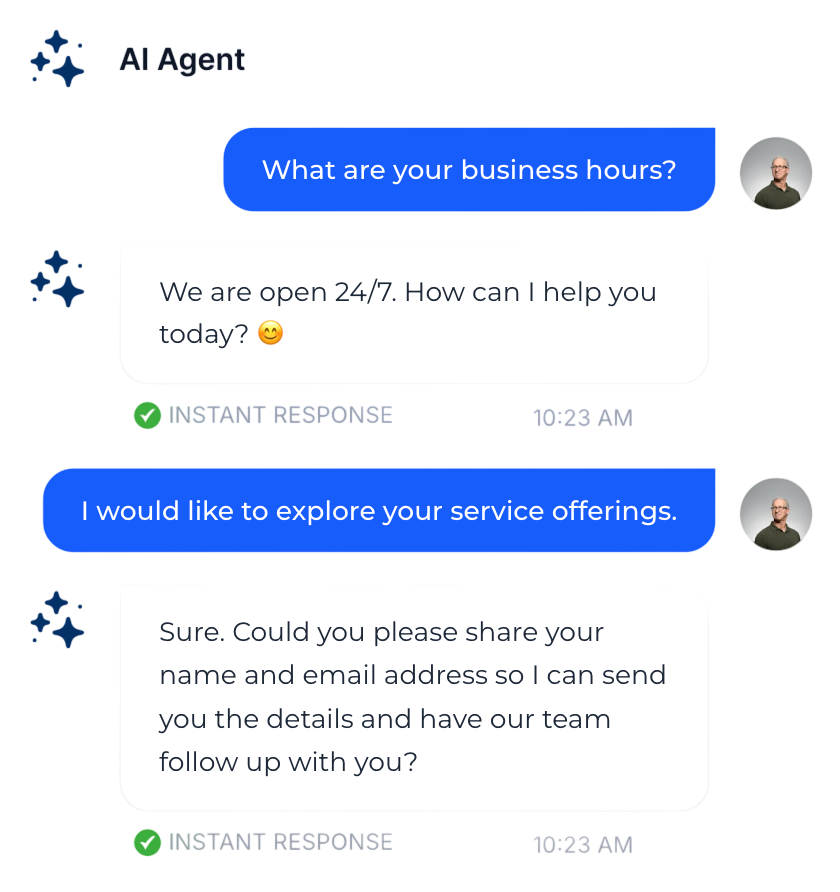 AI agent chatbots reply instantly, increasing customer satisfaction and capturing more leads. No waiting times, no business hours limitations.